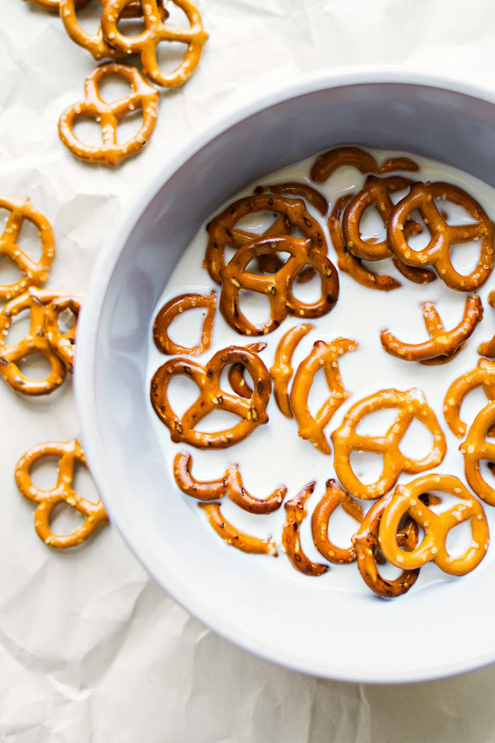 Place the milk and pretzels into a large bowl and give it a swirl to make sure all of the pretzels are coated in milk. Cover the bowl with plastic wrap and place in the fridge for 1.5 hours.